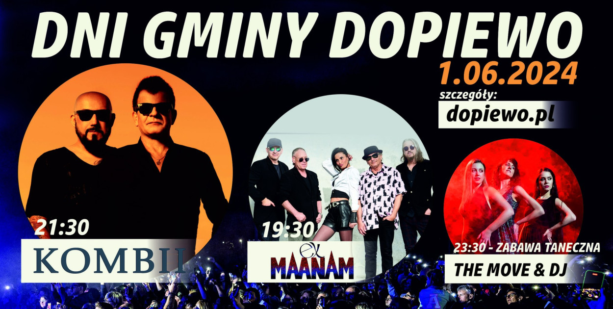 Już w najbliższą sobotę (1.06), odbędzie się wielkie święto mieszkanek i mieszkańców Gminy Dopiewo, wszystko za sprawą Dni Gminy Dopiewo 2024, których gwiazdą będą: zespół KOMBII (z Grzegorzem Skawińskim i Waldemarem Tkaczykiem), przed którym wystąpi grupa ExMAANAM (stworzona przez dwóch współzałożycieli MAANAMU – Pawła Markowskiego i Ryszarda Olesińskiego, w którym śpiewa Karolina Leszko ze „Złotego Maanamu. Oba koncerty przypomną po kilkanaście niezapomnianych hitów polskiej muzyki rozrywkowej. Z pewnością nie zabraknie „Słodkiego, miłego życia” i „Kocham Cię kochanie moje”. Będzie głośno i przebojowo.